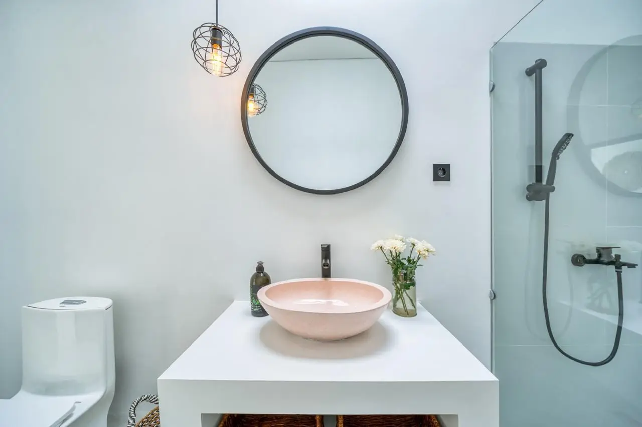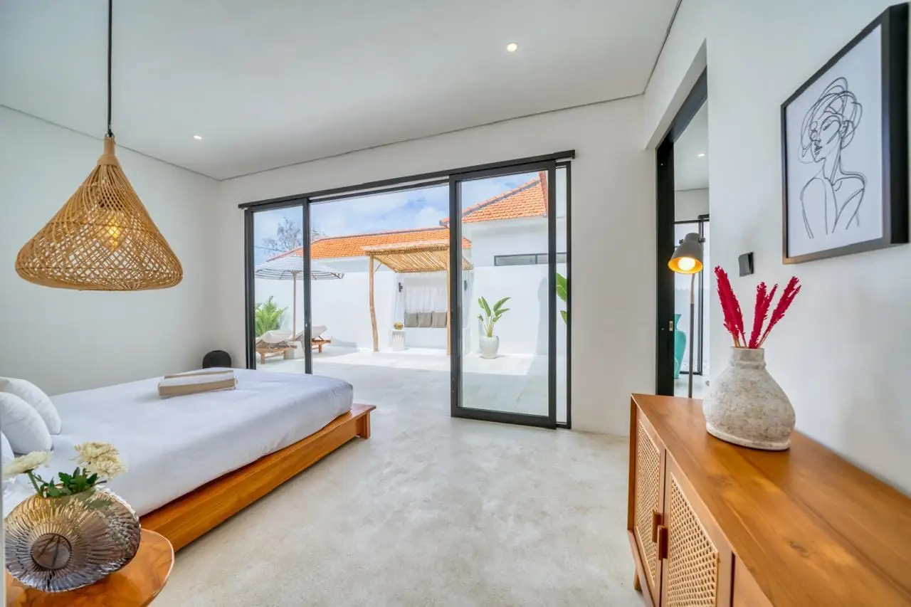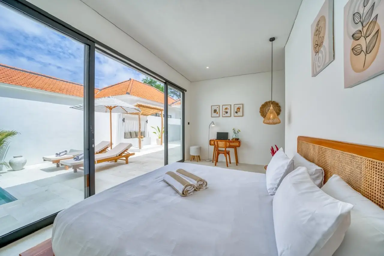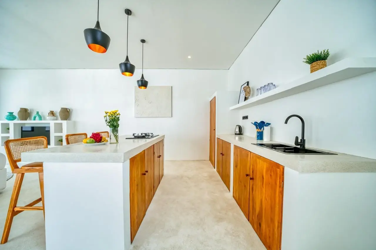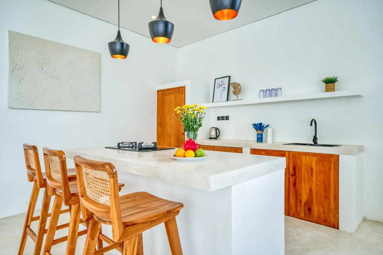 The villa features an enclosed living and dining area, creating a comfortable and private sanctuary. Large windows flood the space with natural light while maintaining a cool and refreshing atmosphere. A stylish kitchenette is well-equipped, offering convenience whether you’re preparing a simple breakfast or hosting guests for a cozy dinner.