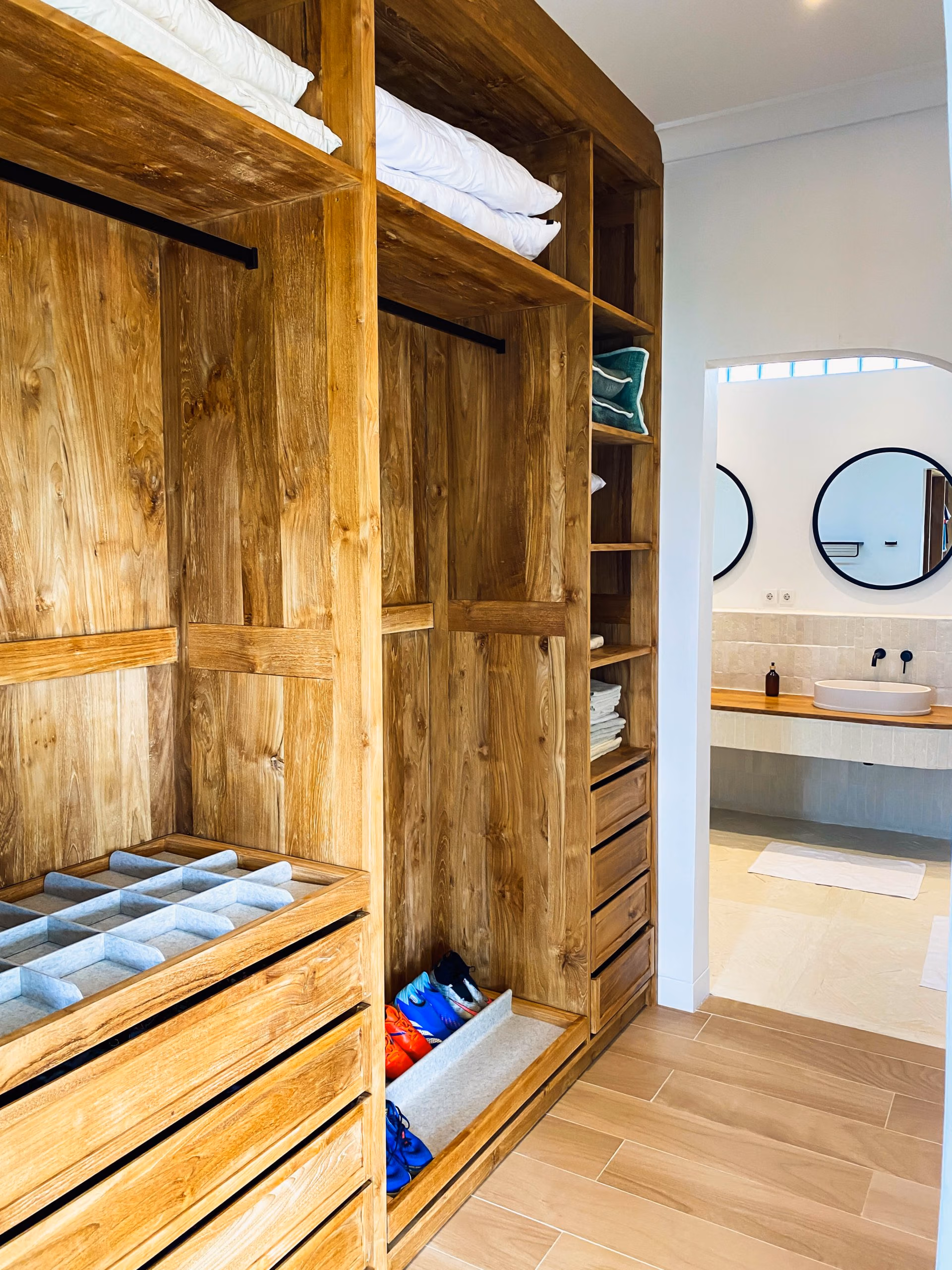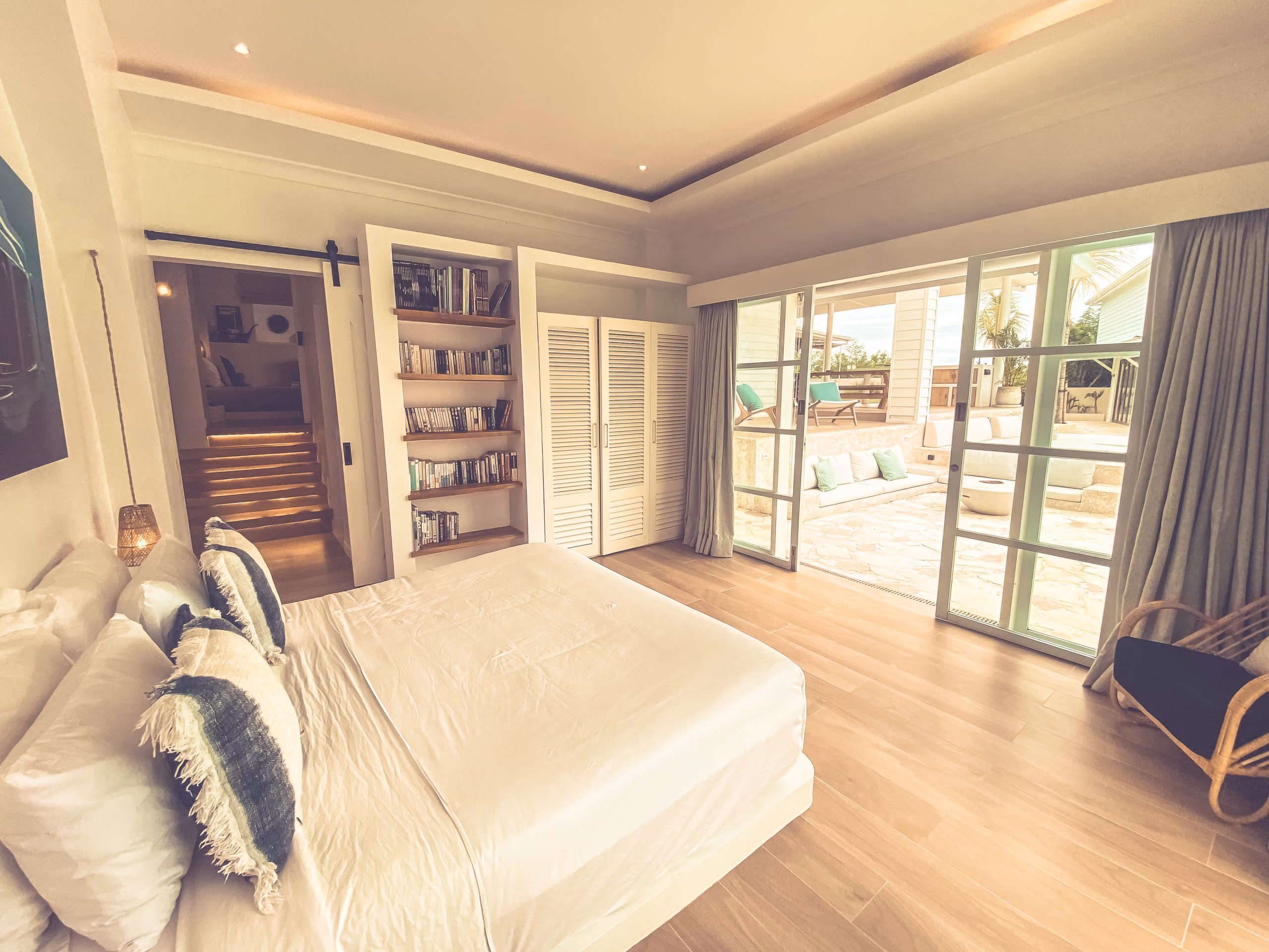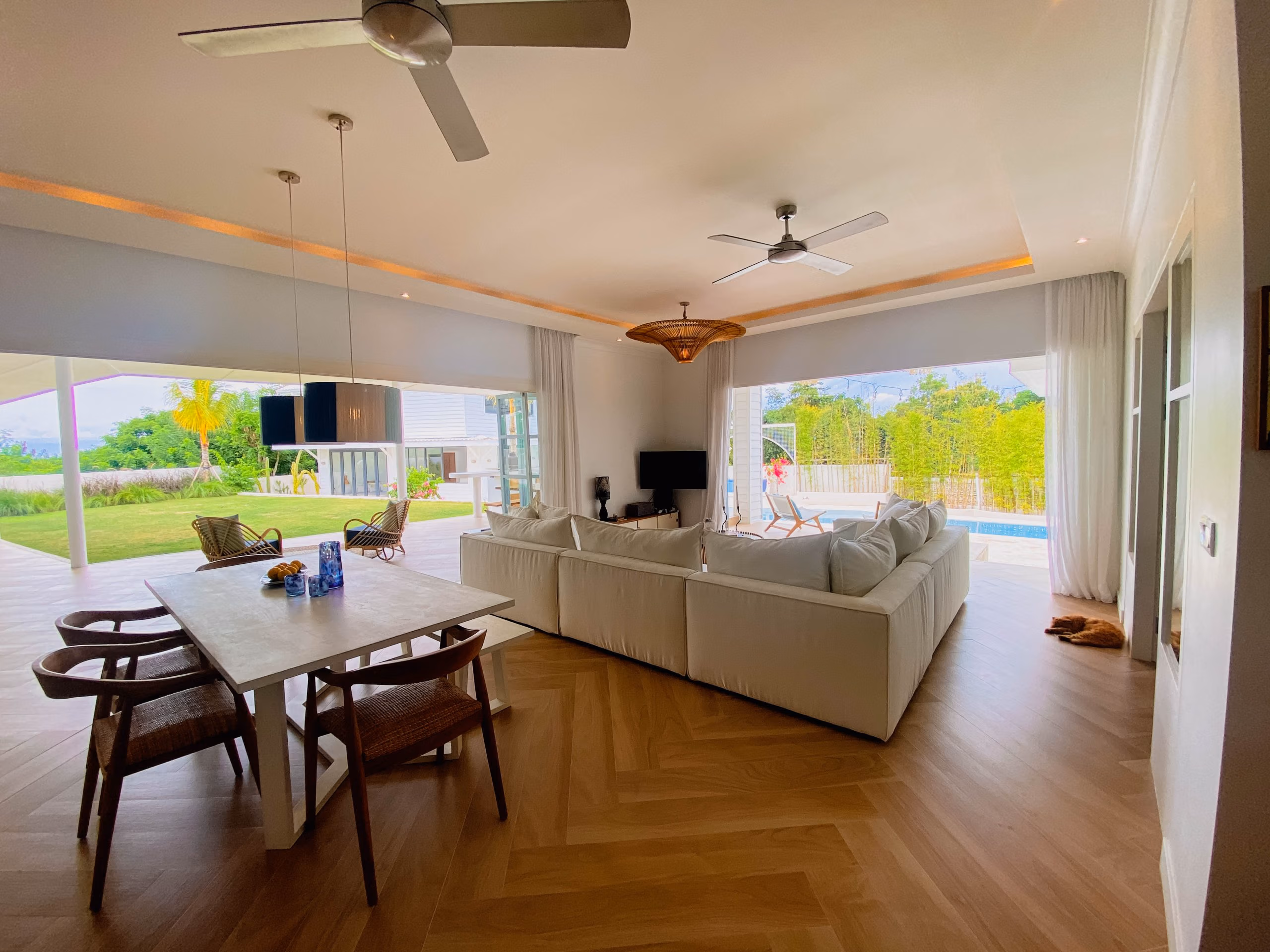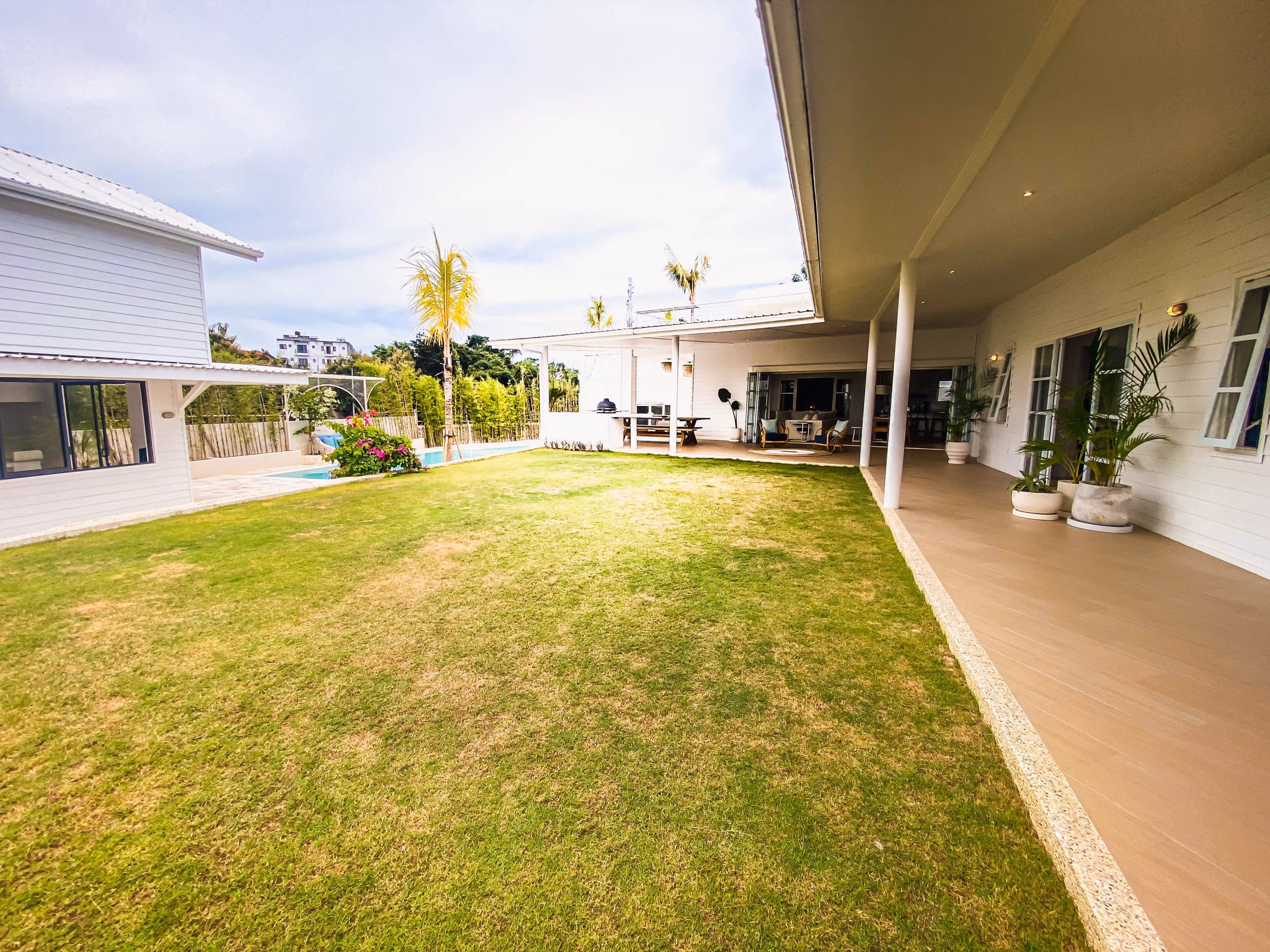 This villa blends modern elegance with tropical charm. The interiors feature high-quality teak wood accents and natural stone bathrooms, adding warmth and character to every room. Meanwhile, the 19-meter swimming pool sits at the heart of the property, surrounded by inviting lounge areas—perfect for relaxation or hosting guests.