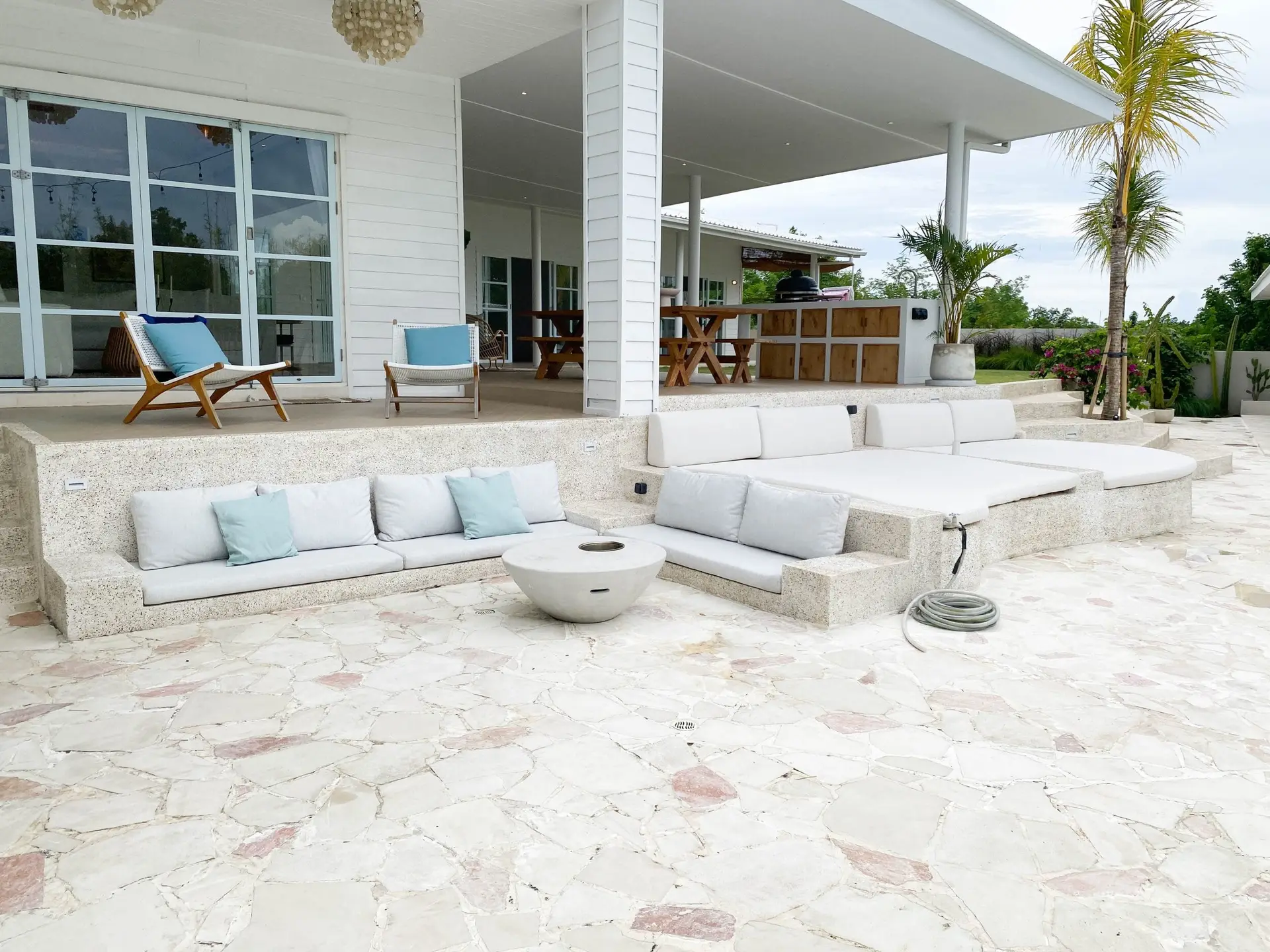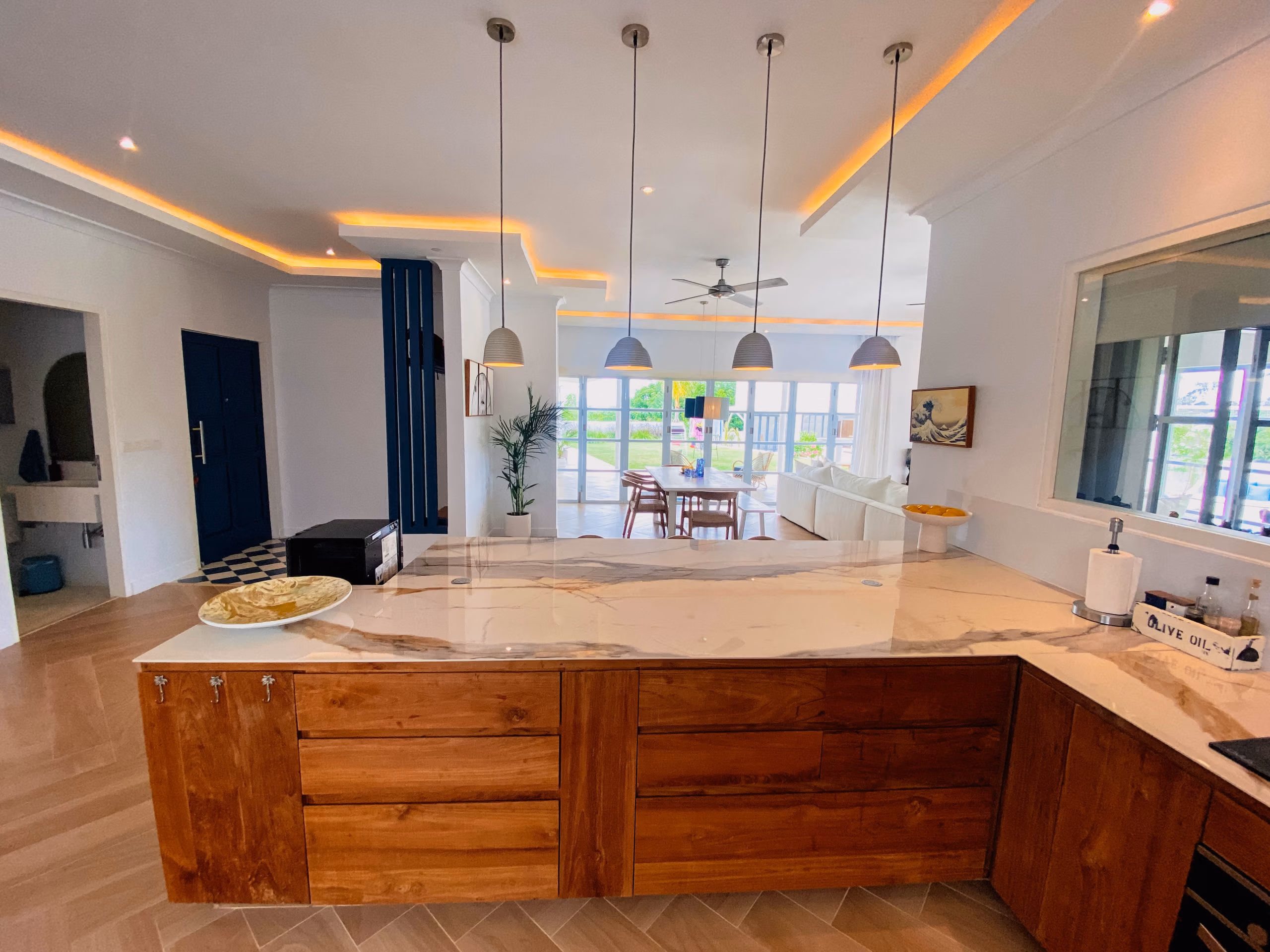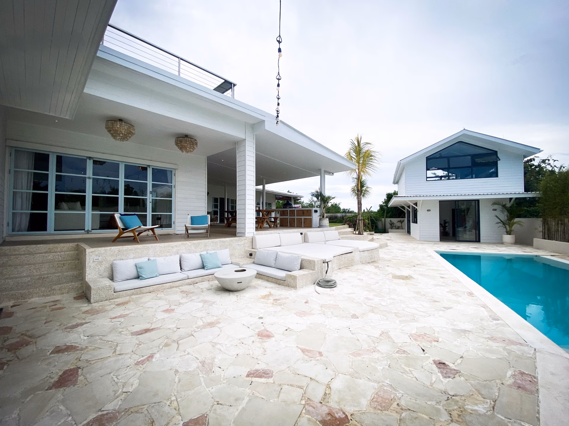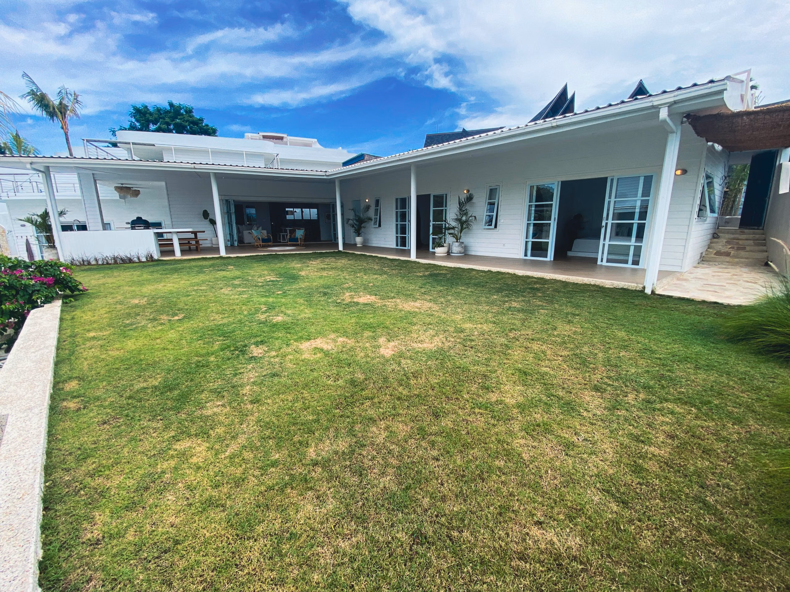 For those who love to cook, the villa includes both indoor and outdoor kitchens, making meal preparation easy and enjoyable. Additionally, a separate office or entertainment room provides a quiet space for work or leisure. The private studio adds even more flexibility, whether used as a guest room, rental unit, or personal retreat.