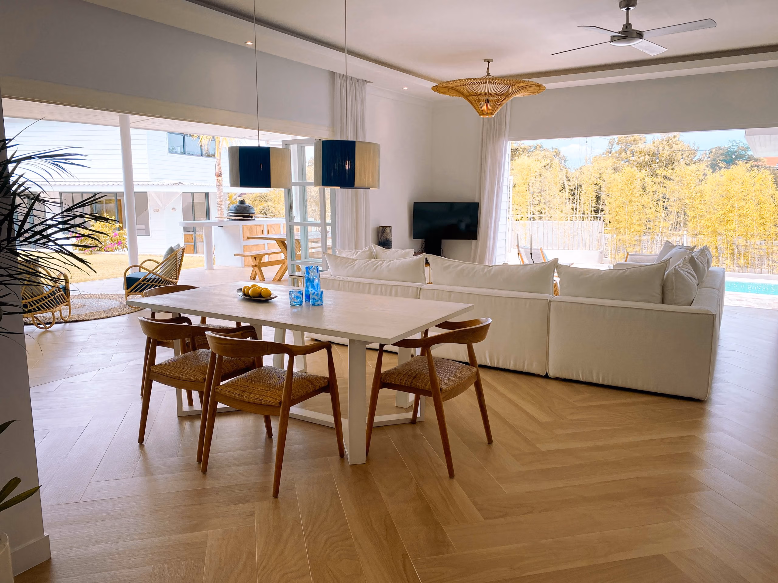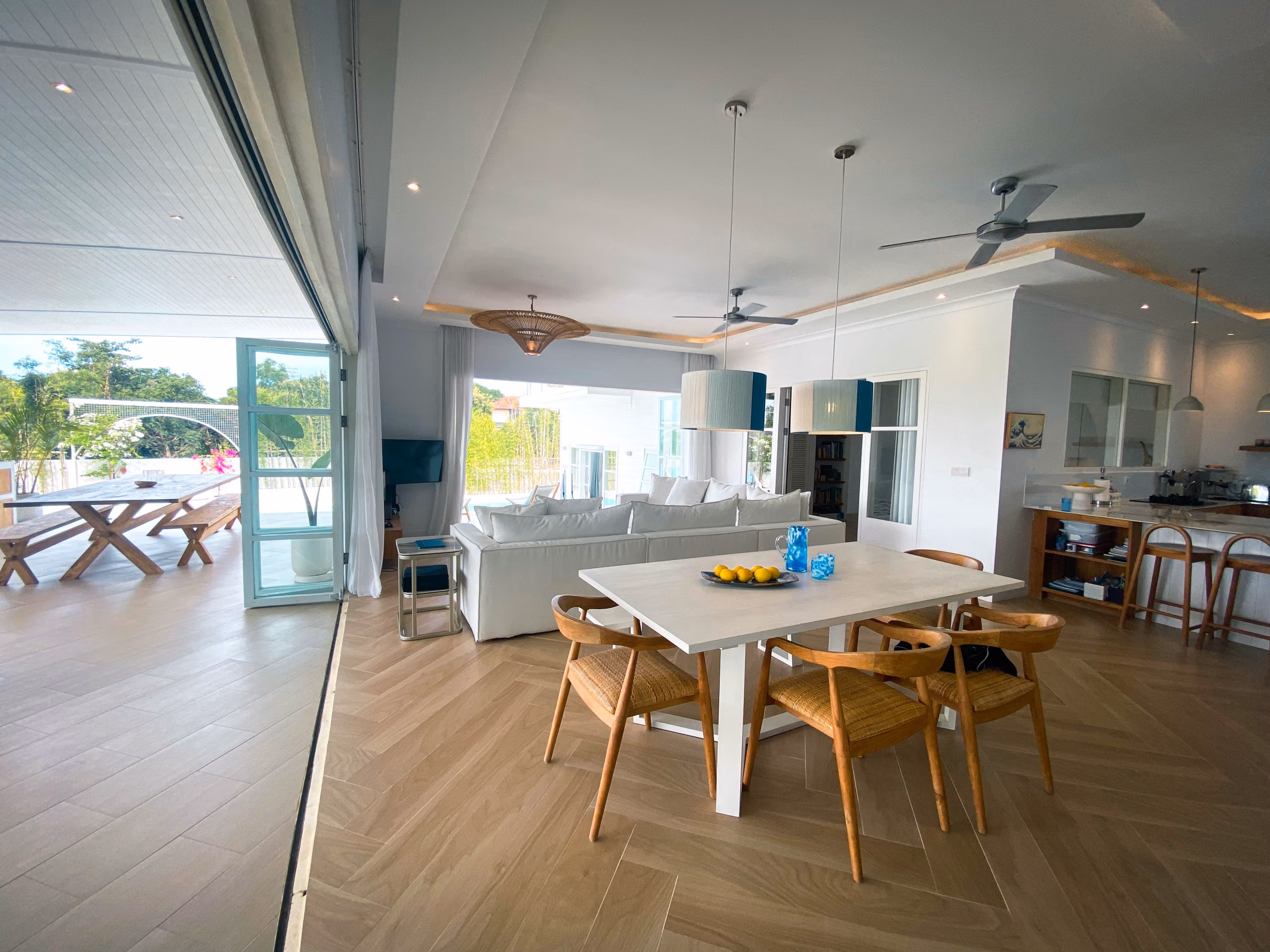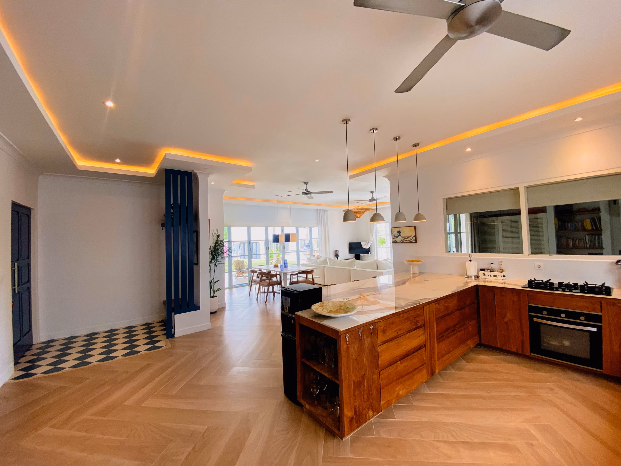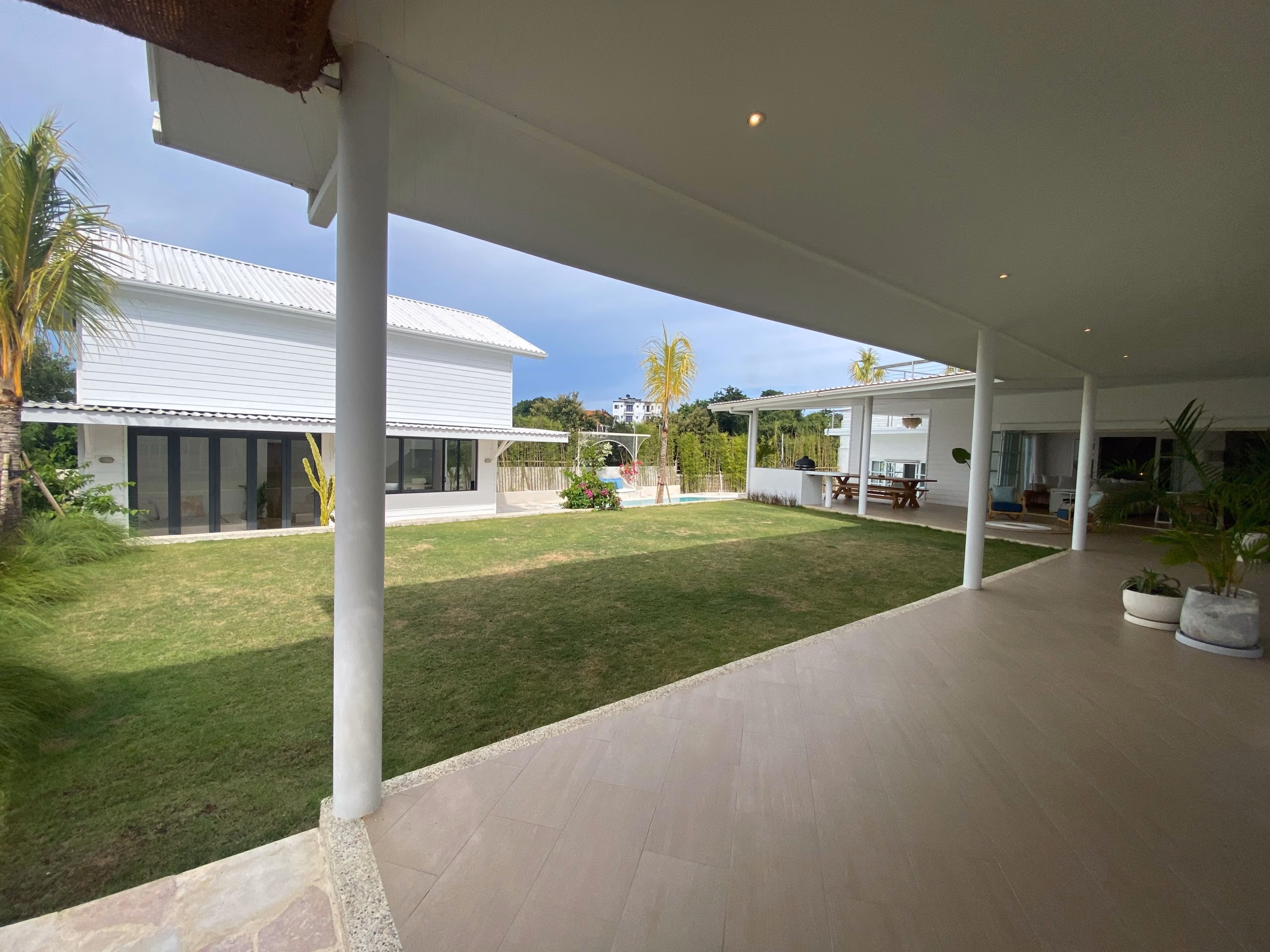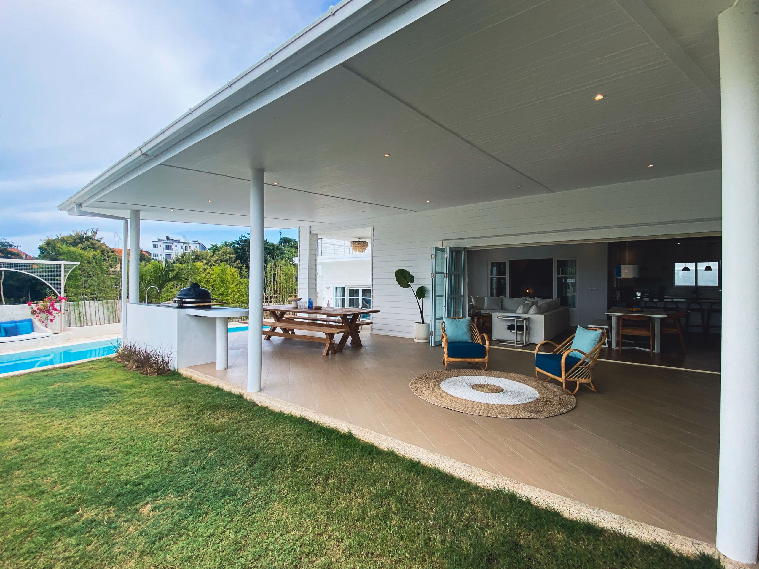 For those who love to cook, the villa includes both indoor and outdoor kitchens, making meal preparation easy and enjoyable. Additionally, a separate office or entertainment room provides a quiet space for work or leisure. The private studio adds even more flexibility, whether used as a guest room, rental unit, or personal retreat.